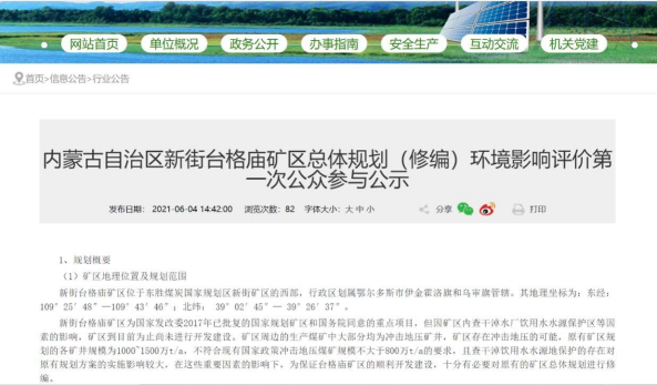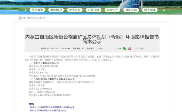 2021 年7月12日在鄂爾多斯市能源局政府網(wǎng)上進(jìn)行了第二次信息公示,同時(shí)在公示中附上了查閱報(bào)告書征求意見稿及公參意見表的公示鏈接,征求公眾對(duì)報(bào)告書征求意見稿的相關(guān)意見,公示時(shí)間共計(jì)為10個(gè)工作日。向公眾公告以下信息: