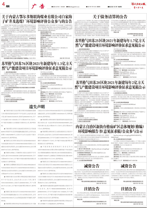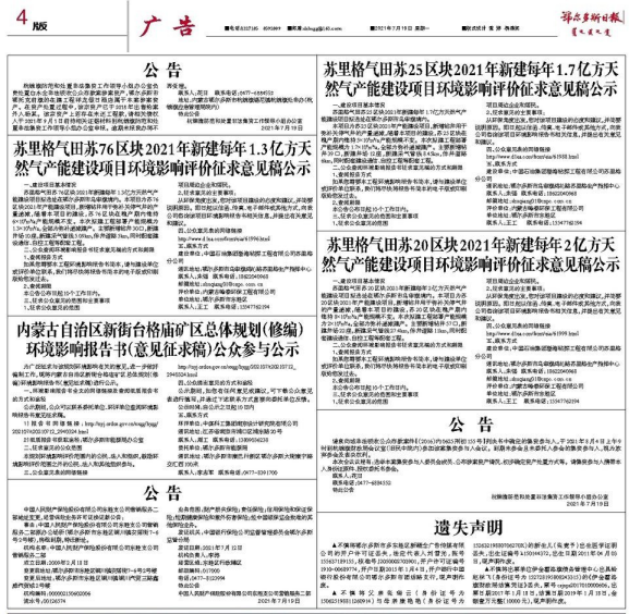 在第二次網(wǎng)絡(luò)公示期間,分別在2021年7月15日和2021年7月19日在鄂爾多斯日?qǐng)?bào)報(bào)紙上進(jìn)行了兩次登報(bào)公示,每次公示時(shí)間為5個(gè)工作日,報(bào)紙公示截圖詳見下圖。